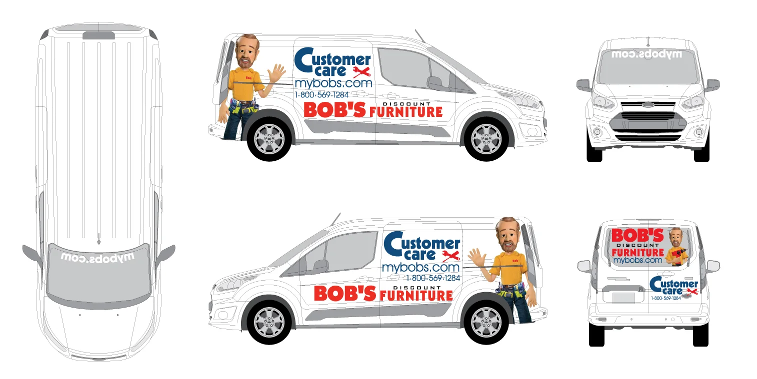 A vehicle wrap for Bob's Discount Furniture Customer Care van - a team of people that help service furniture for customers that have purchased from Bob's.